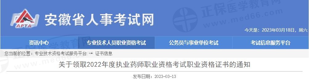 安徽關(guān)于領(lǐng)取2022年度執(zhí)業(yè)藥師職業(yè)資格考試職業(yè)資格證書的通知