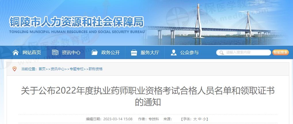 安徽銅陵關(guān)于公布2022年度執(zhí)業(yè)藥師職業(yè)資格考試合格人員名單和領(lǐng)取證書(shū)的通知