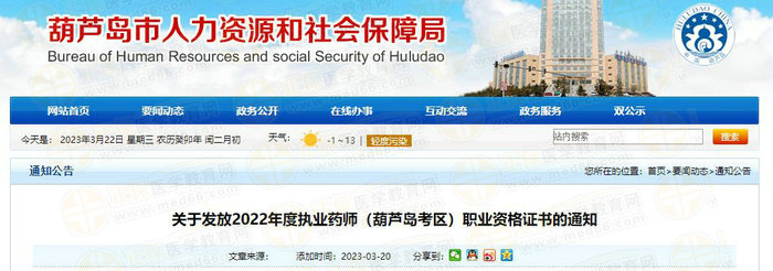 關(guān)于發(fā)放2022年度執(zhí)業(yè)藥師(遼寧葫蘆島考區(qū))職業(yè)資格證書(shū)的通知