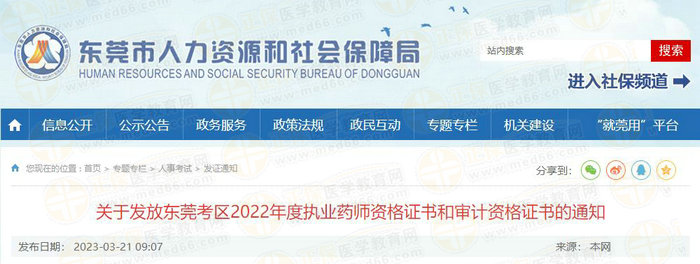 關(guān)于發(fā)放廣東東莞考區(qū)2022年度執(zhí)業(yè)藥師資格證書的通知