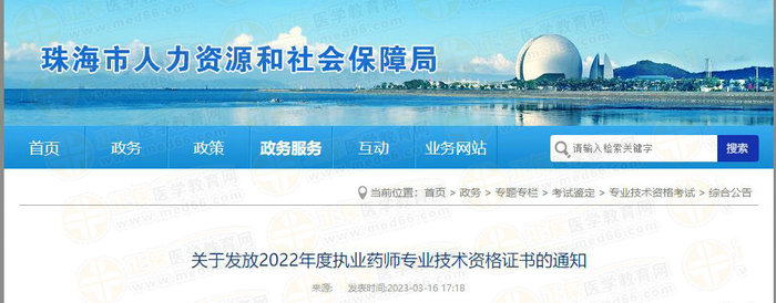 廣東珠海關(guān)于發(fā)放2022年度執(zhí)業(yè)藥師專業(yè)技術(shù)資格證書的通知