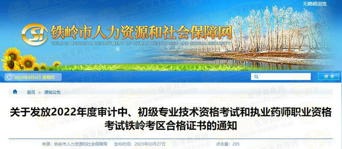 鐵嶺市職業(yè)技能鑒定中心(鐵嶺市人事考試中心)定于3月28日起,發(fā)放2022年度審計中、初級專業(yè)技術資格考試和執(zhí)業(yè)藥師職業(yè)資格考試鐵嶺考區(qū)合格證書。現將發(fā)放證書事宜通知如下: