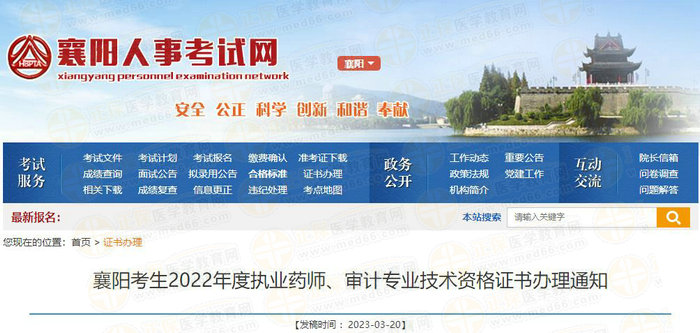 湖北襄陽考生2022年度執(zhí)業(yè)藥師資格證書辦理通知