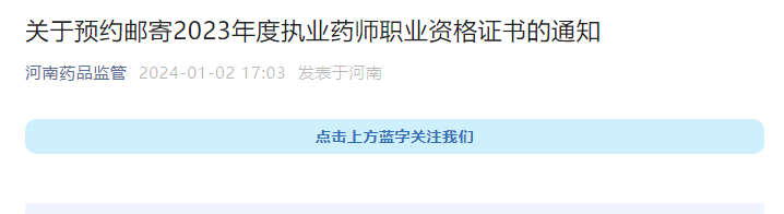 【河南】2023年執(zhí)業(yè)藥師證書預(yù)約郵寄時(shí)間:2024年1月2日-1月25日