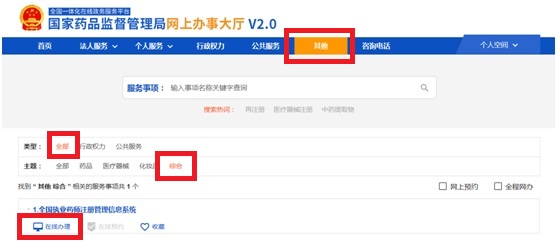 2、登錄后在標(biāo)題欄中單擊“其他”,在“主題”項(xiàng)目中選“綜合”,再選擇“全國執(zhí)業(yè)藥師注冊管理信息系統(tǒng)”的“在線辦理”。