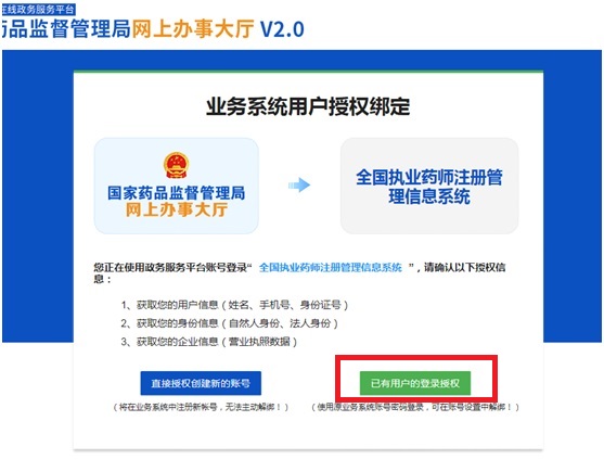 3、首次辦理執(zhí)業(yè)藥師注冊用戶,進(jìn)行業(yè)務(wù)系統(tǒng)用戶授權(quán)綁定,選擇“已有用戶的登錄授權(quán)”。“用戶名”輸入國家藥品監(jiān)督管理局執(zhí)業(yè)藥師注冊平臺中證件號碼(報考執(zhí)業(yè)藥師身份證件號碼),密碼默認(rèn)無需輸入,輸入驗(yàn)證碼,登錄。驗(yàn)證成功即賬號綁定了“全國執(zhí)業(yè)藥師注冊管理信息系統(tǒng)”,下次選擇“全國執(zhí)業(yè)藥師注冊管理信息系統(tǒng)在線辦理”即可直接進(jìn)入執(zhí)業(yè)藥師注冊頁面,選擇注冊省份和注冊辦理模式進(jìn)行個人注冊申報。