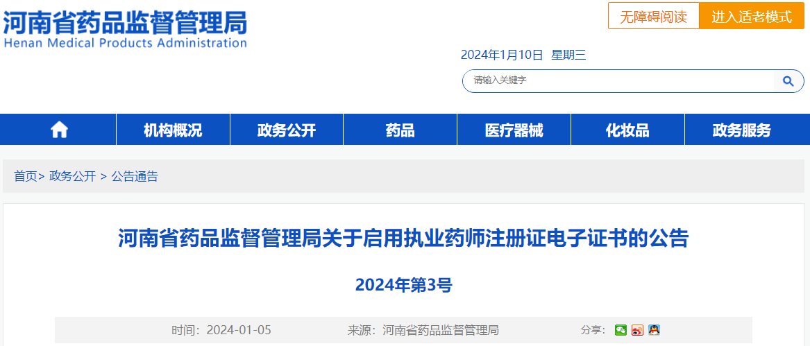 【河南】1月8日起正式啟用執(zhí)業(yè)藥師注冊證電子證書!