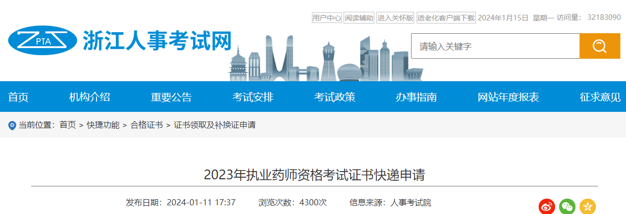 【浙江】2023年執(zhí)業(yè)藥師資格考試證書(shū)快遞申請(qǐng)