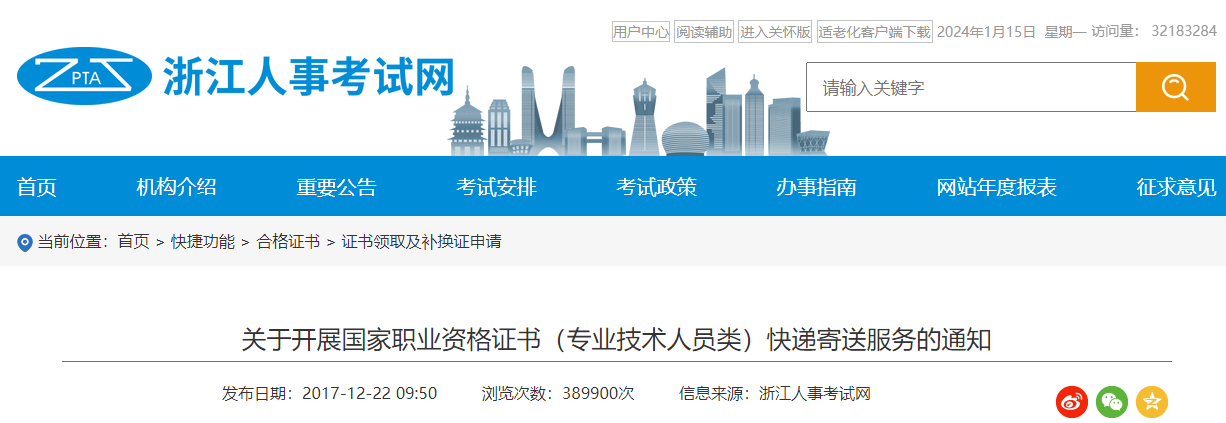 為貫徹落實(shí)浙江省人民政府辦公廳《關(guān)于加快推進(jìn)“互聯(lián)網(wǎng)+政務(wù)服務(wù)”證照快遞寄送服務(wù)的通知》(浙江政務(wù)服務(wù)網(wǎng)﹝2016﹞9號(hào))的精神,加快推進(jìn)政務(wù)服務(wù)網(wǎng)上辦理、快遞送達(dá),實(shí)現(xiàn)群眾、企業(yè)到政府辦事“一事最多上門一次”的要求,經(jīng)研究決定對(duì)國(guó)家職業(yè)資格證書(shū)(專業(yè)技術(shù)人員類)(以下簡(jiǎn)稱“證書(shū)”)采用快遞形式進(jìn)行發(fā)放,現(xiàn)將相關(guān)情況通知如下: