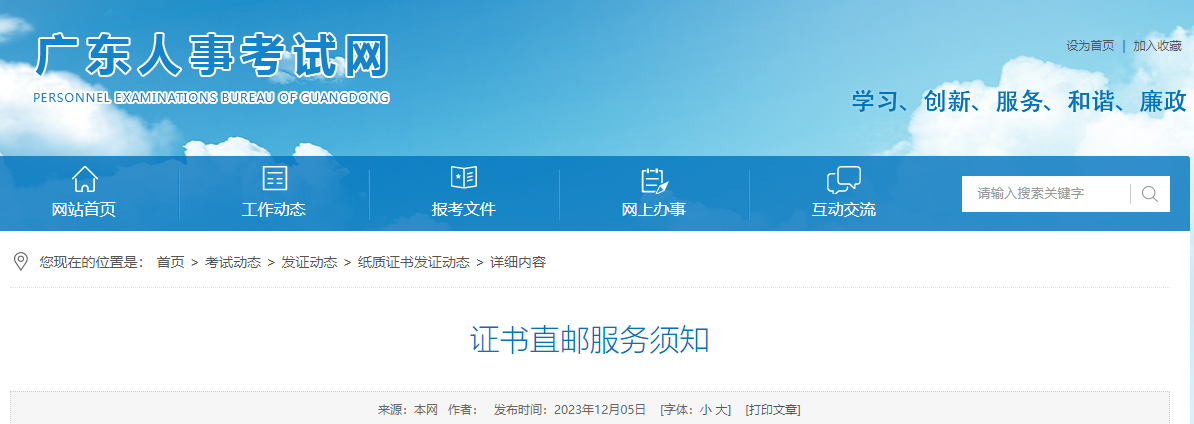 (一)全科成績合格考生可登錄廣東人事考試網(wǎng)--“廣東省專業(yè)技術(shù)人員職業(yè)資格考試業(yè)務(wù)辦理系統(tǒng)”(以下簡稱“系統(tǒng)”),在首頁選擇證書郵寄模塊,點擊“證書直郵”欄目填寫郵寄信息提交證書直郵申請。(提交申請前請核對郵寄信息確保準確無誤,需填寫常用的手機號碼并確保暢通,用以接收投遞驗證碼簽收證書。如填寫手機號碼有誤,將無法簽收證書。)