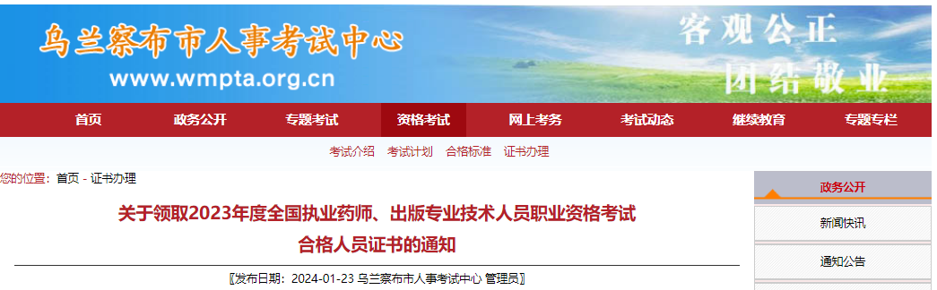 【烏蘭察布】關(guān)于領(lǐng)取2023年度全國(guó)執(zhí)業(yè)藥師、出版專(zhuān)業(yè)技術(shù)人員職業(yè)資格考試合格人員證書(shū)的通知