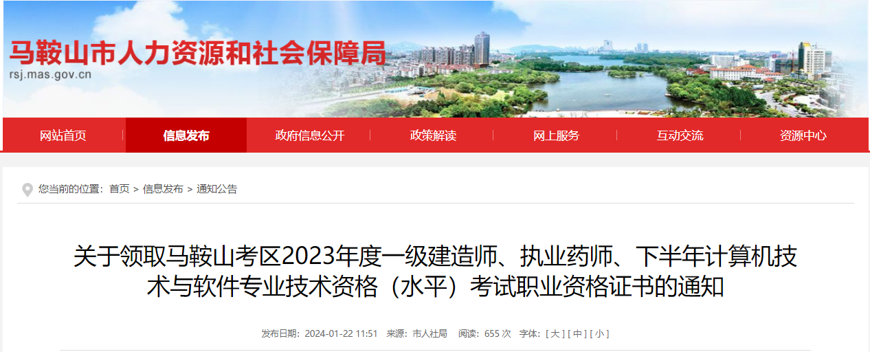 【安徽馬鞍山】關(guān)于領(lǐng)取馬鞍山考區(qū)2023年度執(zhí)業(yè)藥師、一級建造師、下半年計算機技術(shù)與軟件專業(yè)技術(shù)資格(水平)考試職業(yè)資格證書的通知