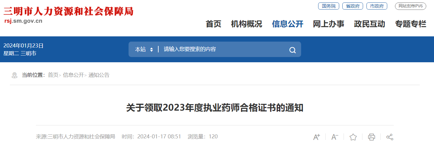 【福建三明市】關(guān)于領(lǐng)取2023年度執(zhí)業(yè)藥師合格證書(shū)的通知