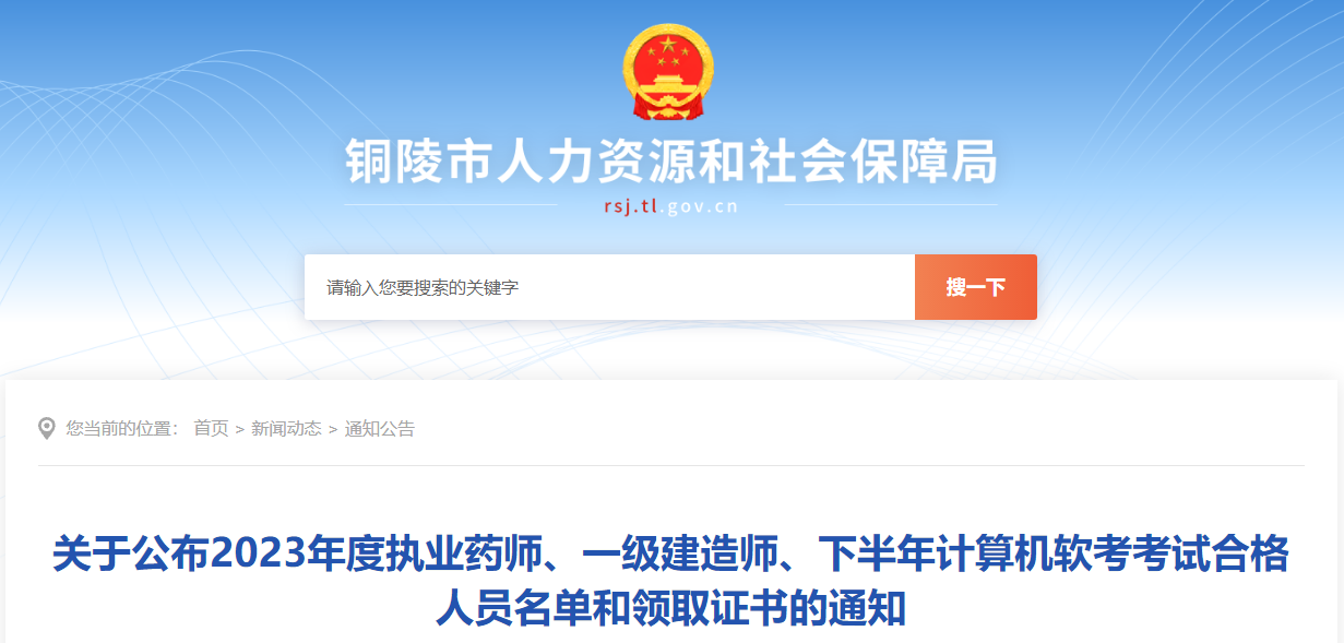 【安徽銅陵】2023年執(zhí)業(yè)藥師、一級建造師、下半年計算機軟考考試合格人員名單和證書領(lǐng)取通知