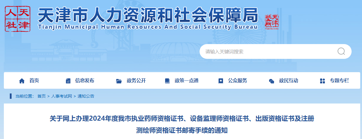 為滿足廣大考生需要,減少考生往返路程和排隊(duì)等候,天津市人才考評(píng)中心與中國(guó)郵政速遞物流股份有限公司天津市分公司合作,開(kāi)通2024年度我市執(zhí)業(yè)藥師資格證書、設(shè)備監(jiān)理師資格證書、出版資格證書及注冊(cè)測(cè)繪師資格證書郵政EMS寄遞業(yè)務(wù)。具體事項(xiàng)通知如下: