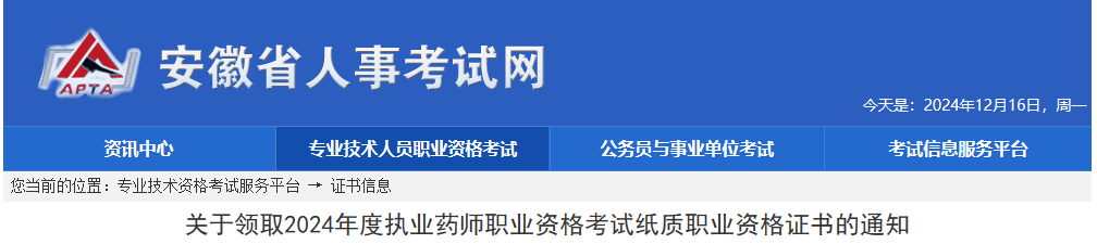 【安徽】2024年執(zhí)業(yè)藥師職業(yè)資格考試紙質(zhì)職業(yè)資格證書領(lǐng)取通知