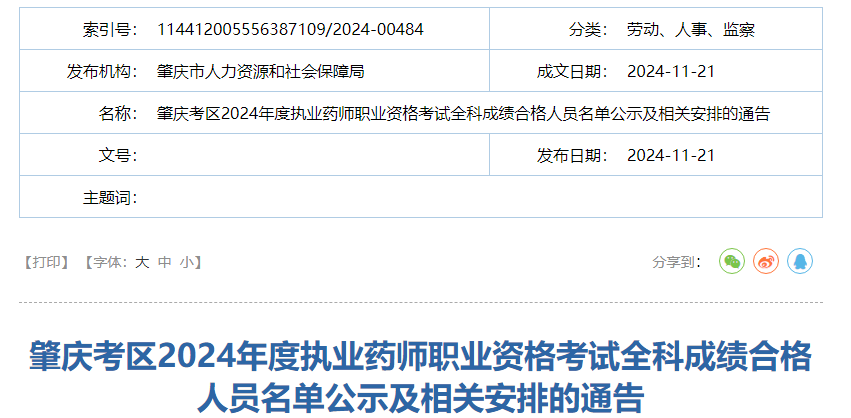 【廣東肇慶】2024年執(zhí)業(yè)藥師考試全科成績(jī)合格人員名單公示及證書領(lǐng)取通知
