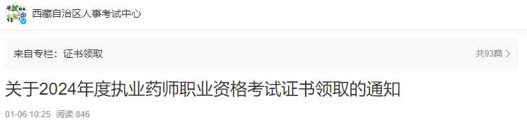 【西藏】關(guān)于2024年度執(zhí)業(yè)藥師職業(yè)資格考試證書領(lǐng)取的通知