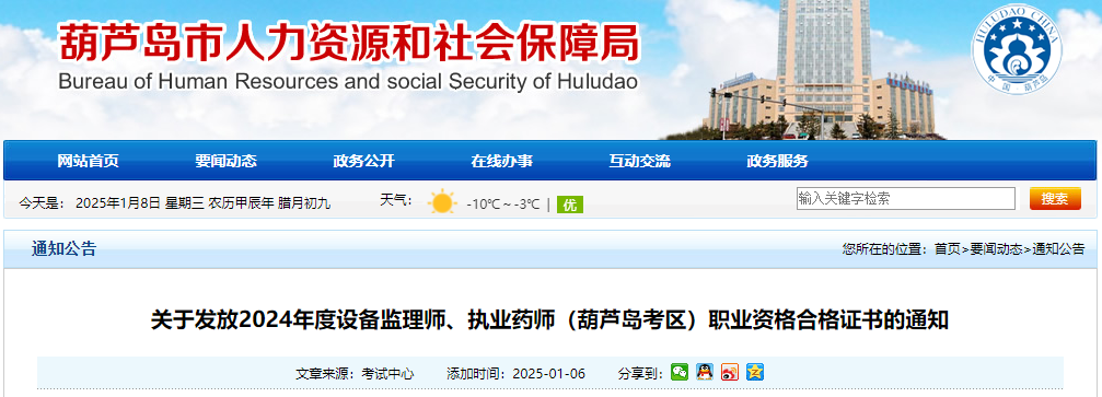 【遼寧葫蘆島】關于發(fā)放2024年度設備監(jiān)理師、執(zhí)業(yè)藥師職業(yè)資格合格證書的通知