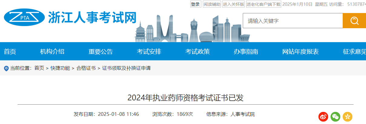 【浙江】2024年執(zhí)業(yè)藥師資格考試證書1月8日已發(fā)