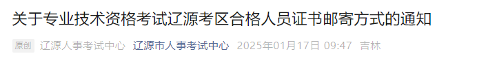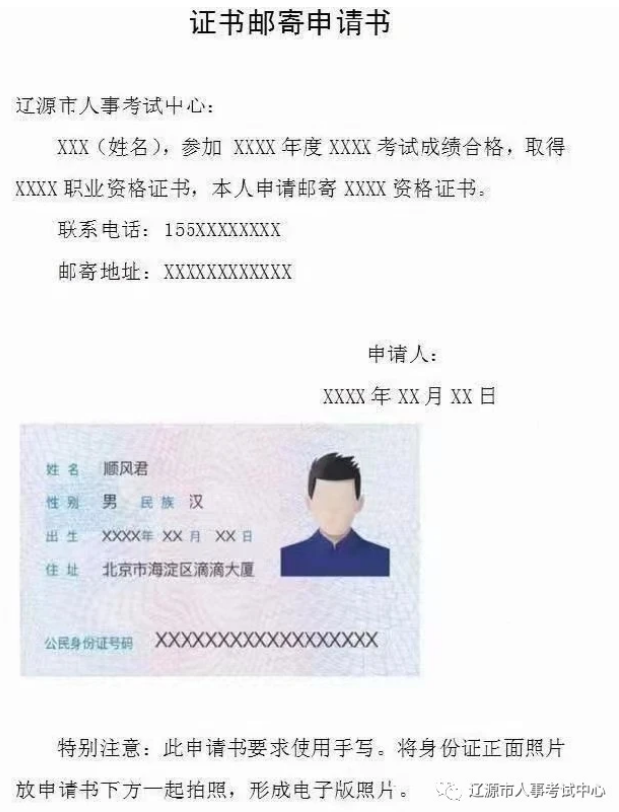 1.考生須關(guān)注“遼源市人事考試中心”微信公眾號(hào),查看歷史消息-“關(guān)于專業(yè)技術(shù)資格考試遼源考區(qū)合格人員證書郵寄方式的通知”,按照“證書郵寄申請(qǐng)書”圖片示例(圖片在下方)要求,填寫證書領(lǐng)取相關(guān)信息,并做成圖片,發(fā)送至QQ郵箱(2694152438@qq.com),辦理證書郵寄。