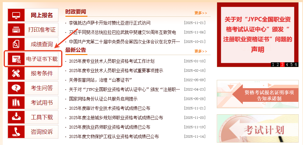 第一步:進(jìn)入中國(guó)人事考試網(wǎng)——“電子證書下載”