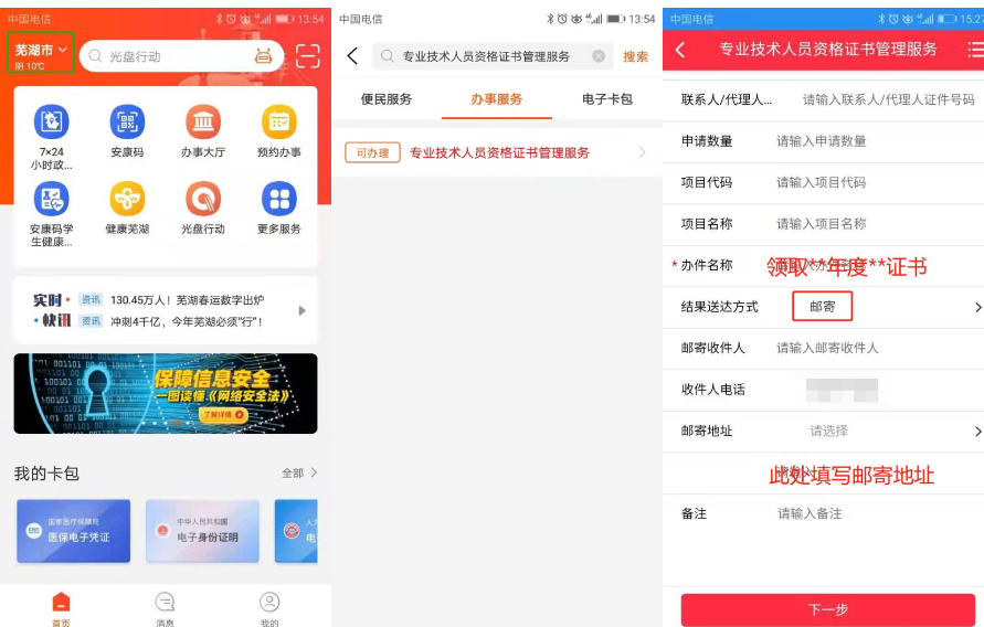 方式1:移動(dòng)端申請(qǐng)(推薦使用),手機(jī)下載皖事通APP,城市選擇蕪湖,搜索欄搜索“專業(yè)技術(shù)人員資格證書管理服務(wù)”,在線辦理。