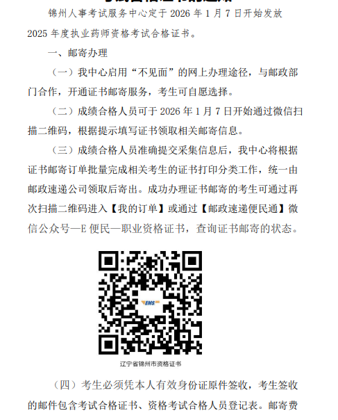 【遼寧錦州】關(guān)于發(fā)放2025年度執(zhí)業(yè)藥師考試合格證書的通知
