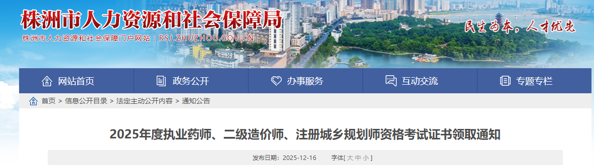 【湖南株洲】2025年度執(zhí)業(yè)藥師、二級造價師、注冊城鄉(xiāng)規(guī)劃師資格考試證書領(lǐng)取通知