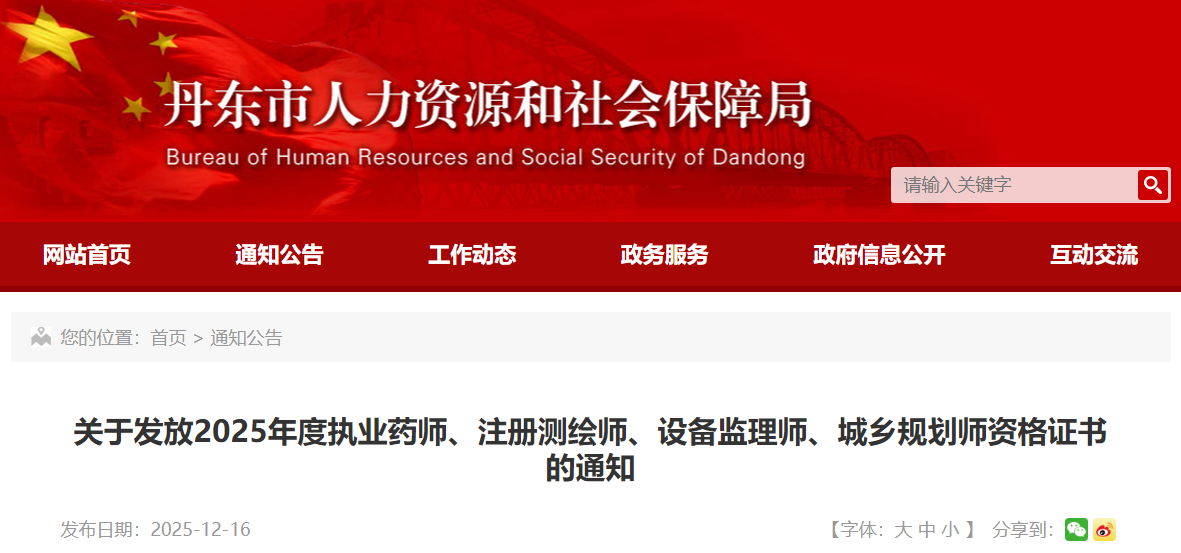 【遼寧丹東】關(guān)于發(fā)放2025年度執(zhí)業(yè)藥師、注冊(cè)測(cè)繪師、設(shè)備監(jiān)理師、城鄉(xiāng)規(guī)劃師資格證書(shū)的通知