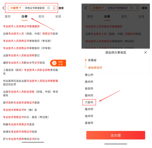 2.輸入“專業(yè)技術(shù)人員資格證書管理服務(wù)”,選擇“辦事”模塊,點(diǎn)擊下方“專業(yè)技術(shù)人員資格證書管理服務(wù)”,選擇辦事地區(qū)“六安市”,點(diǎn)擊“去辦理”。