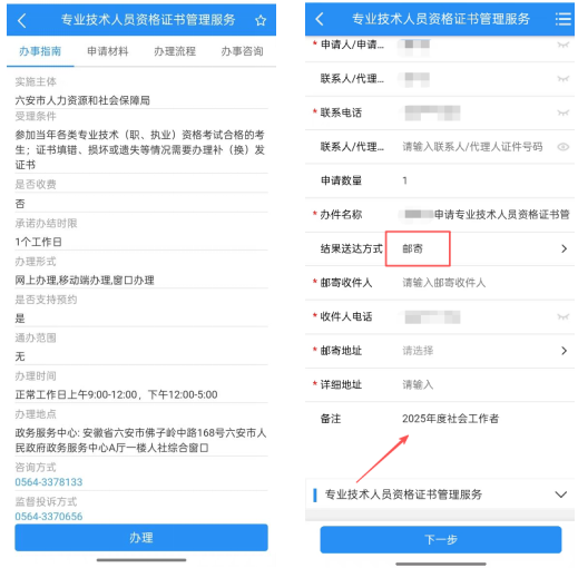 3.“結(jié)果送達(dá)方式”選擇“郵寄”,完善郵寄收件人姓名、電話、地址等信息,在“備注”欄填寫擬申領(lǐng)證書的考試年度和名稱,如“2025年度社會(huì)工作者”,點(diǎn)擊“下一步”,最后在跳轉(zhuǎn)的頁面中點(diǎn)擊“提交申請(qǐng)”即可完成。