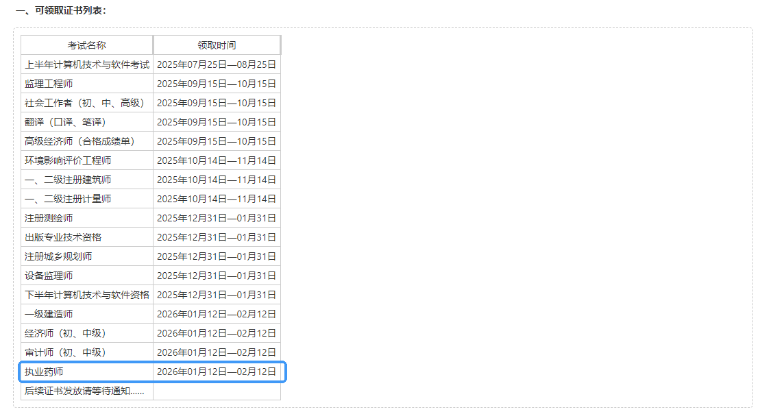 一、領(lǐng)取時間:執(zhí)業(yè)藥師2026年1月12日-2月12日