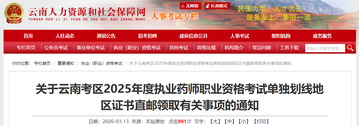 【云南】2025年度執(zhí)業(yè)藥師職業(yè)資格考試單獨劃線地區(qū)證書直郵領(lǐng)取有關(guān)事項通知