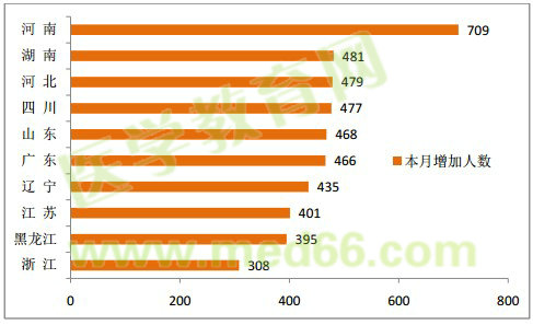 本月注冊(cè)人數(shù)增加前十位的省份:河南、湖南、河北、四川、山東、廣東、遼寧、江蘇、黑龍江、浙江(見附表 1,圖 1)。