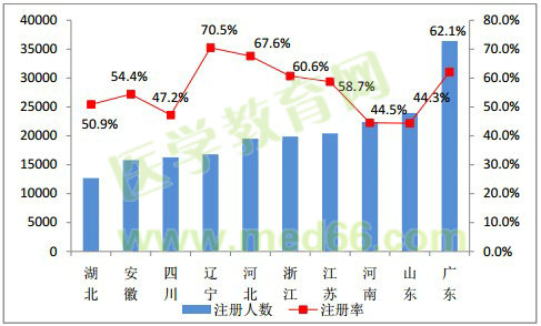 圖 2 執(zhí)業(yè)藥師注冊(cè)人數(shù)前十位省份情況