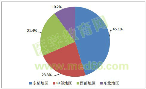 執(zhí)業(yè)藥師按區(qū)域分布情況:東部地區(qū)151338人,中部地區(qū)78167人,西部地區(qū)71836人,東北地區(qū)34014人,分別占注冊(cè)總數(shù)45.1%、23.3%、21.4%、10.2%(見圖4)。