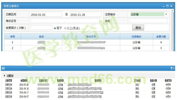 5.單擊“變更注冊(cè)頻次”,輸入查詢條件,篩選多頻次變更人員信息。