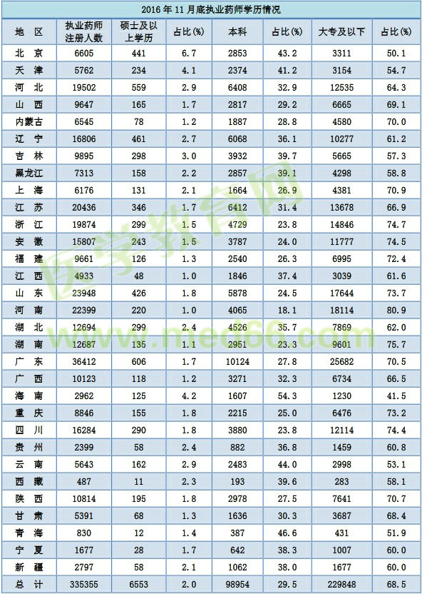 截至2016年11月30日,執(zhí)業(yè)藥師學(xué)歷分布情況:研究生6553人,本科98954人,大專119948人,中專109900人;本科及以上學(xué)歷占比31.5%(見表1、附表4)。