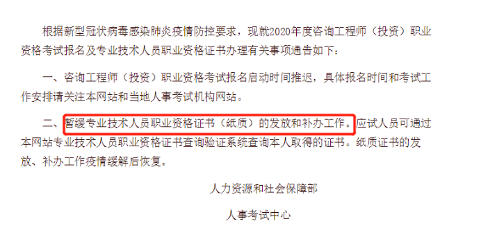 其實(shí)在中國(guó)人事考試網(wǎng)的《疫情防控期間有關(guān)事項(xiàng)的通告》文件中,已經(jīng)更新了相關(guān)內(nèi)容:暫緩專(zhuān)業(yè)技術(shù)人員職業(yè)資格證書(shū)(紙質(zhì))的發(fā)放和補(bǔ)辦工作。應(yīng)試人員可通過(guò)本網(wǎng)站專(zhuān)業(yè)技術(shù)人員職業(yè)資格證書(shū)查詢驗(yàn)證系統(tǒng)查詢本人取得的證書(shū)。紙質(zhì)證書(shū)的發(fā)放、補(bǔ)辦工作疫情緩解后恢復(fù)。