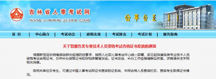 吉林省人事考試網(wǎng)在2020年2月5日的時(shí)候,發(fā)布了一個(gè)《關(guān)于暫緩各類(lèi)專(zhuān)業(yè)技術(shù)人員資格考試合格證書(shū)發(fā)放的通知》,直接就說(shuō)說(shuō)明了關(guān)于證書(shū)延緩發(fā)放的事情。