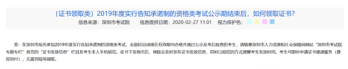 答:在深圳市報(bào)名參加2019年度實(shí)行告知承諾制的資格類(lèi)考試,全部科目成績(jī)?cè)谟行趦?nèi)合格并通過(guò)公示及考后核查的考生,請(qǐng)留意深圳市人力資源和社會(huì)保障局網(wǎng)站“深圳市考試院專(zhuān)題專(zhuān)欄”首頁(yè)的“證書(shū)發(fā)放信息”欄目及考生本人手機(jī)短信。證書(shū)下發(fā)我市后,我院會(huì)及時(shí)發(fā)布證書(shū)發(fā)放信息,同時(shí)以短信的方式提醒考生發(fā)放時(shí)間。考生可即時(shí)申請(qǐng)證書(shū)郵遞服務(wù)(費(fèi)用到付),無(wú)需到現(xiàn)場(chǎng)領(lǐng)取。