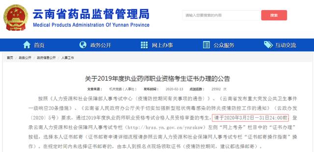 按照《人力資源和社會(huì)保障部人事考試中心〈疫情防控期間有關(guān)事項(xiàng)的通告〉》、《云南省發(fā)布重大突發(fā)公共衛(wèi)生事件一級(jí)響應(yīng)20條措施》、《云南省人民政府辦公廳關(guān)于切實(shí)加強(qiáng)新型冠狀病毒感染的肺炎疫情防控工作的通知》(云政辦發(fā)〔2020〕5號(hào))要求,通過2019年度執(zhí)業(yè)藥師職業(yè)資格考試合格人員資格審查的考生,請于2020年3月2日-31日24:00前,登錄云南人力資源和社會(huì)保障網(wǎng)人事考試專欄(http://hrss.yn.gov.cn/ynrsksw)左側(cè)“網(wǎng)上考務(wù)”欄目中的“證書辦理”按鈕,選擇本人證書郵寄(證書郵寄申請?jiān)敿?xì)流程請參照云南人力資源和社會(huì)保障網(wǎng)人事考試專欄“證書郵寄操作指南”操作)。
