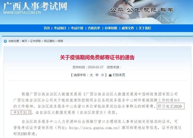 自治區(qū)政務(wù)服務(wù)中心人力資源和社會(huì)保障廳窗口辦理領(lǐng)取人事考試相關(guān)資格類的證書,可登陸考試證書查詢系統(tǒng)(網(wǎng)址:http://zscx.gxpta.com.cn)填寫郵寄地址等信息,證書將通過郵政EMS寄遞。
