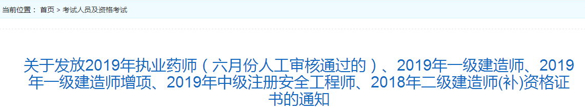 關(guān)于發(fā)放2019年執(zhí)業(yè)藥師(六月份人工審核通過的)、2019年一級建造師、2019年一級建造師增項、2019年中級注冊安全工程師、2018年二級建造師(補)資格證書的通知