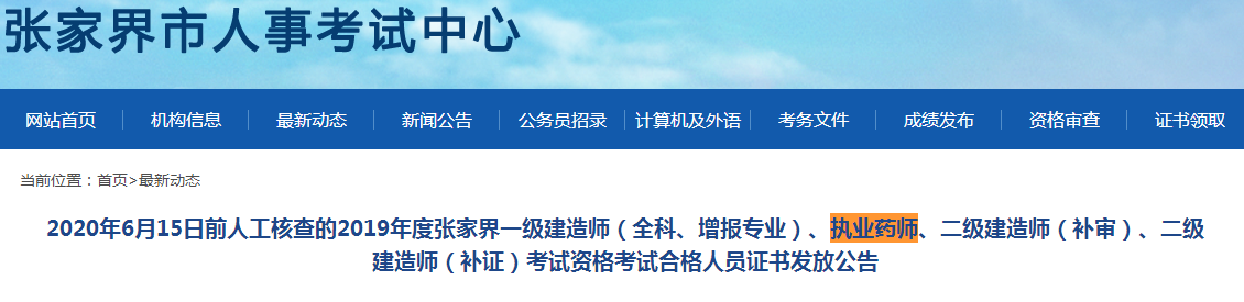 2020年6月15日前人工核查的2019年度張家界一級建造師(全科、增報專業(yè))、執(zhí)業(yè)藥師、二級建造師(補審)、二級建造師(補證)考試資格考試合格人員證書發(fā)放公告