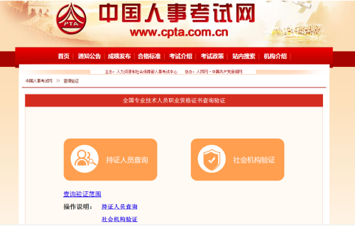 1.查詢驗證網(wǎng)址:人力資源和社會保障部人事考試中心官方網(wǎng)站“中國人事考試網(wǎng)”(www.cpta.com.cn)。