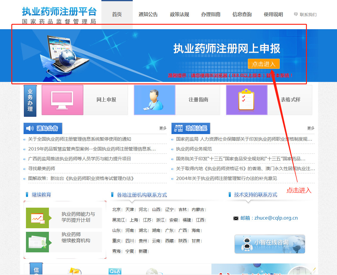 點擊“執(zhí)業(yè)藥師注冊網(wǎng)上申報”(網(wǎng)址:http://zyys.sfda.gov.cn/);
