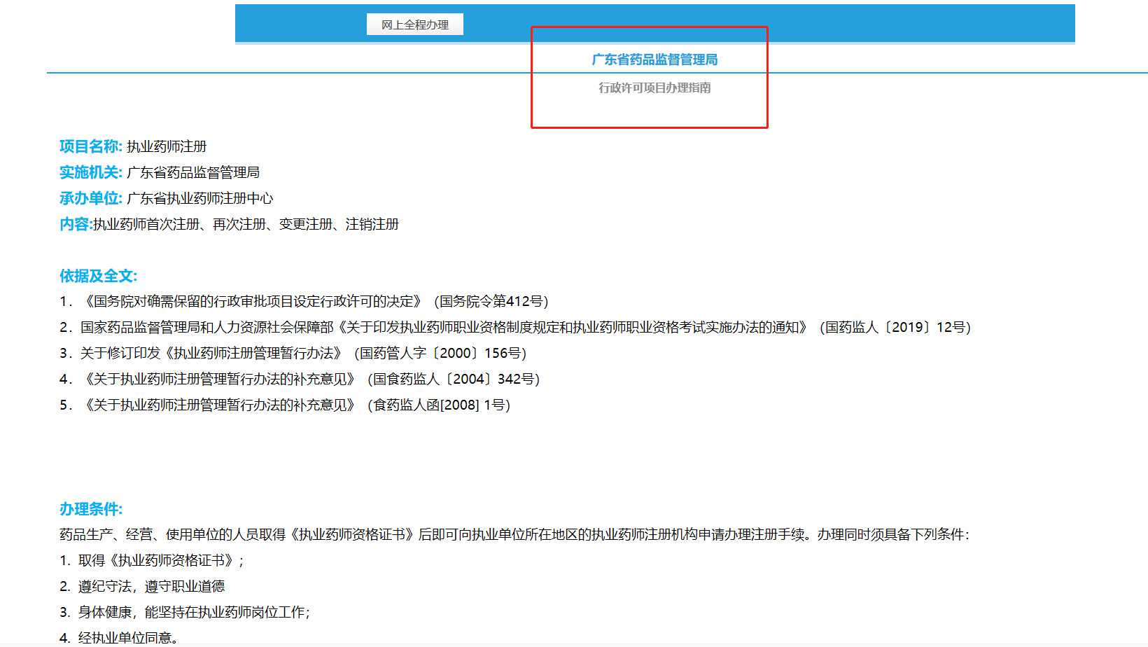 進入【辦理指南】頁面,詳細看完后點擊頁面最下面【網(wǎng)上全程辦理】(以廣東為例)