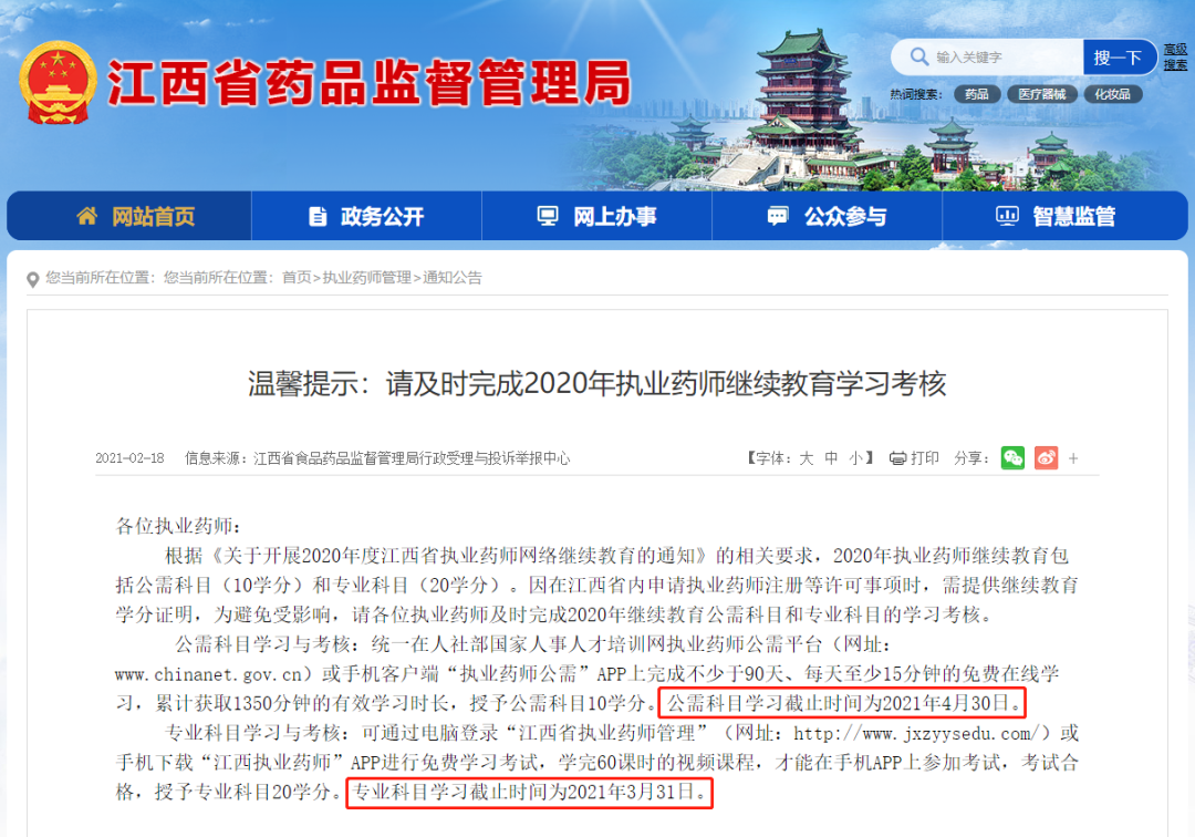 日前江西省藥監(jiān)局發(fā)布通知公告,提醒廣大執(zhí)業(yè)藥師們,注意及時(shí)完成2020年執(zhí)業(yè)藥師繼續(xù)教育學(xué)習(xí)考核。